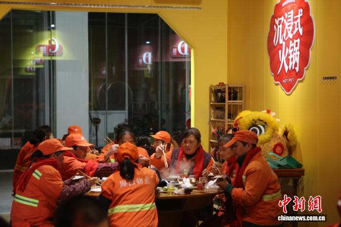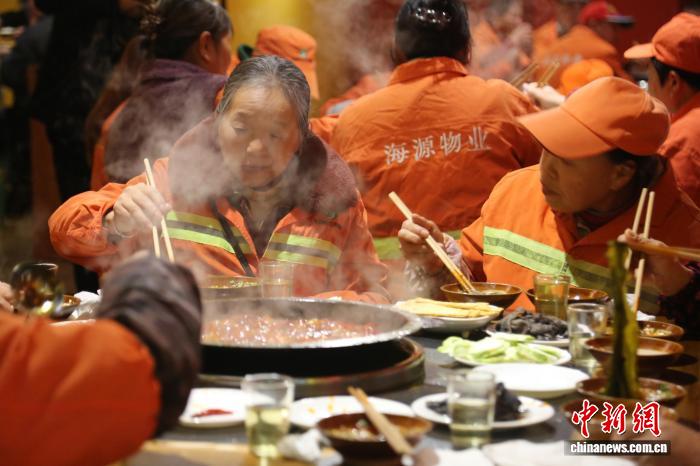 图为环卫工人取保净职员一同收费享受暖锅年夜餐。杨孝永 摄